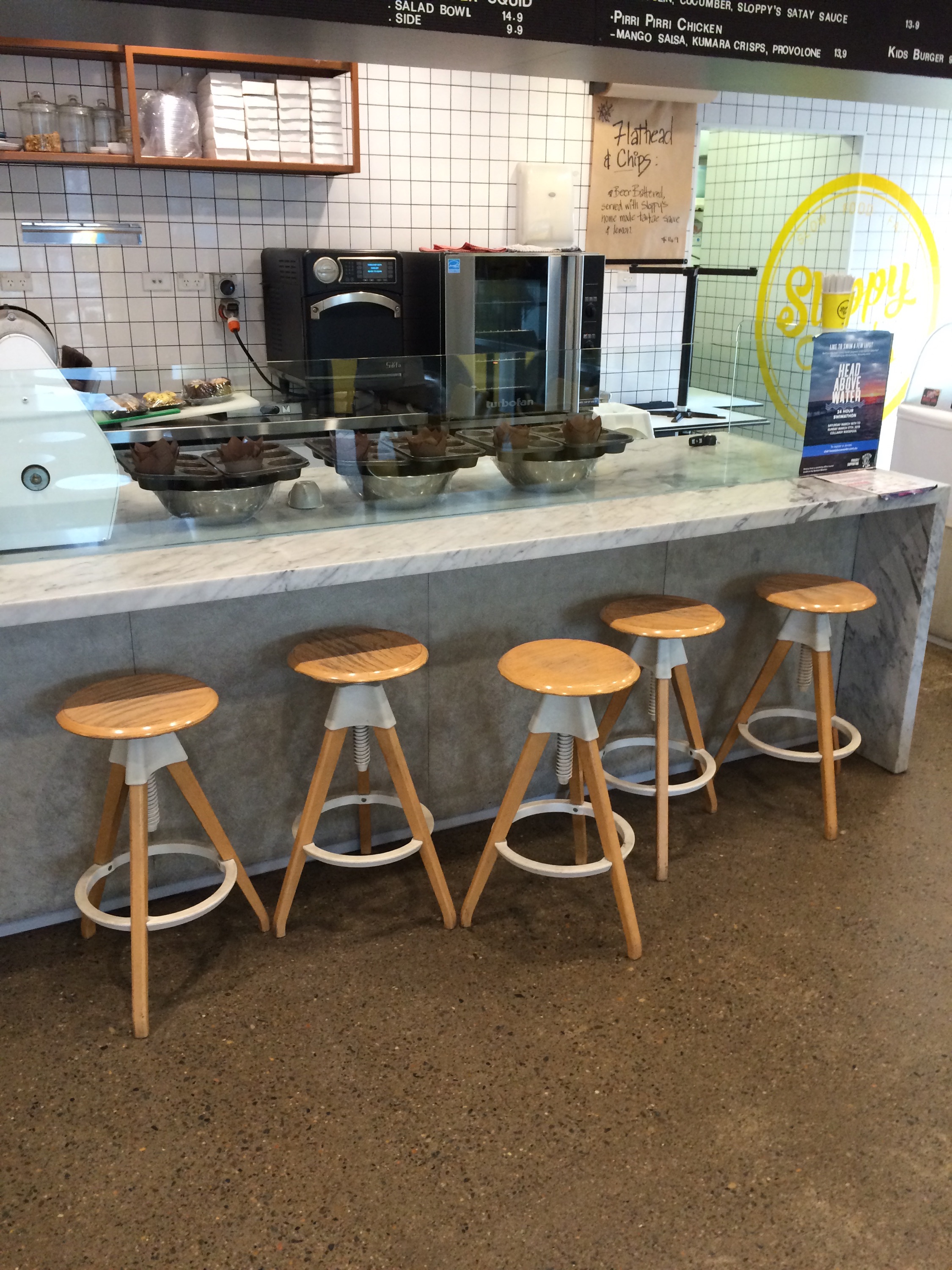 The business model “works” as it has had the benefit of astute owners developing the food & beverages to suit the local affluent clientele who are attracted to the beach front ambience and marble counter-tops overladen with freshly baked : muffins, pastries and goodies from the kitchen, that has a strong following for the slow roasted marinated meats on oven baked buns. Complemented with a range of wellness drinks, coffees and shakes for adults and children.